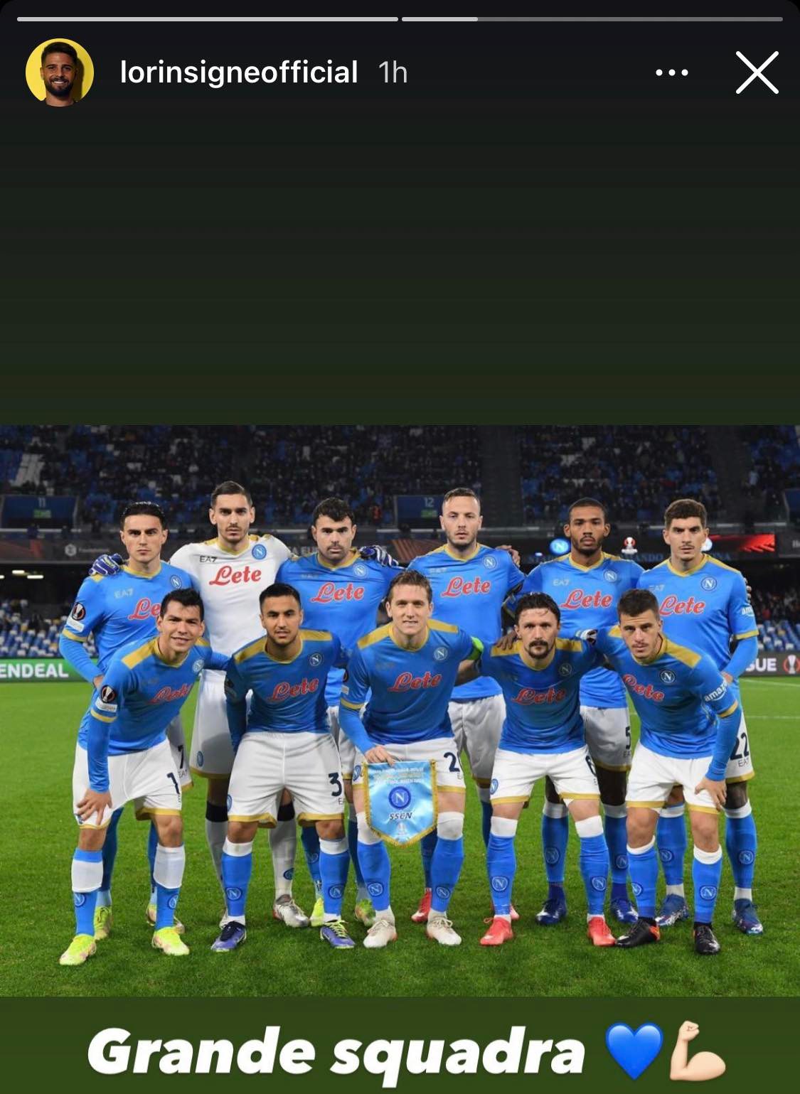 Lorenzo Insigne, ancora fermo ai box e questa sera in tribuna al Maradona, si è congratulato con i compagni per la vittoria contro il Leicester e il passagio al turno successivo in Europa Leauge. Il capitano del Napoli ha postato una foto della formazione scesa in campo stasera in una storia Instagram, scrivendo: "Che squadra!".