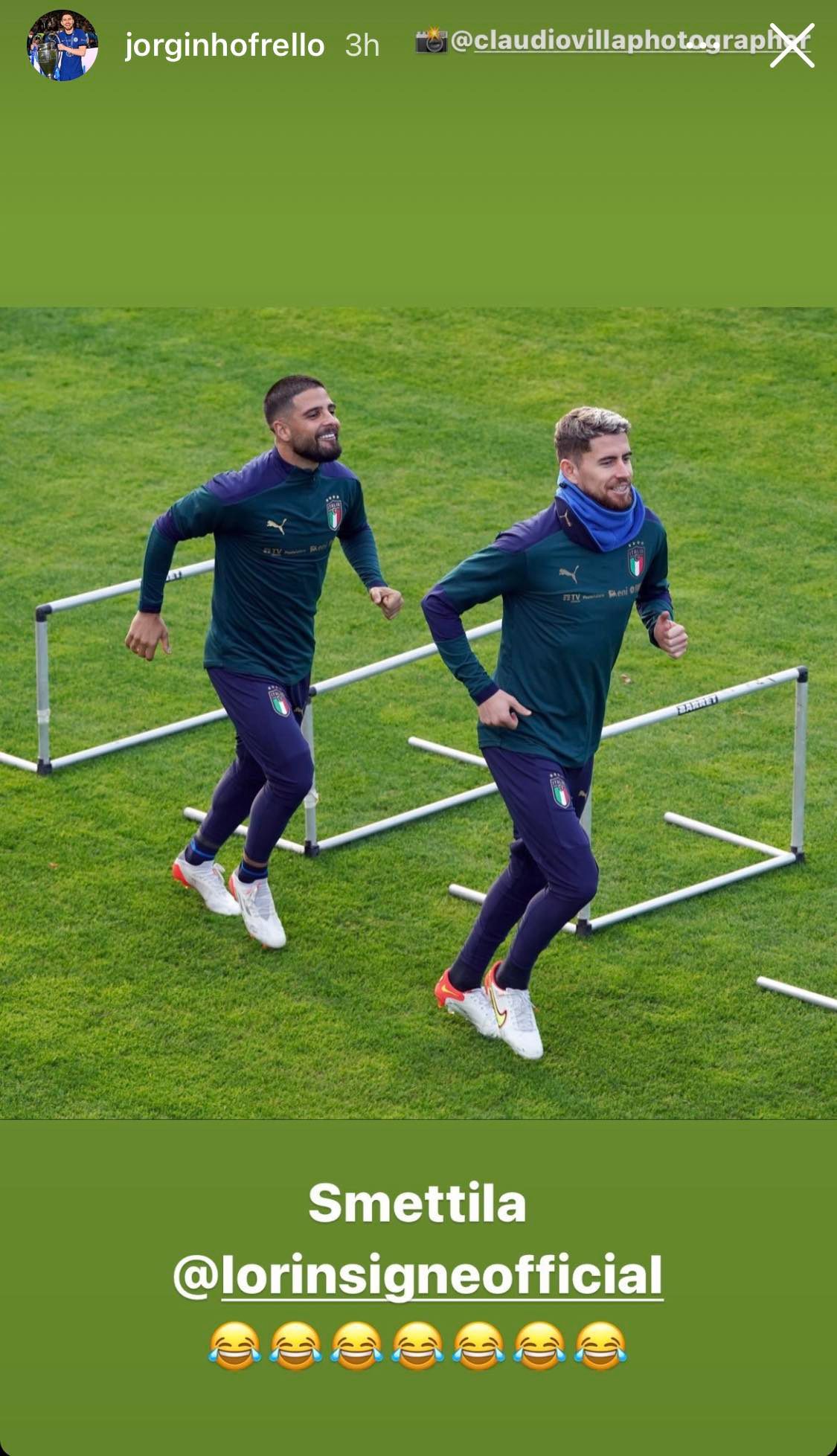 Lorenzo Insigne e Jorginho, ex compagni di squadra al Napoli, si allenano a Coverviano in vista dei prossimi impegni della Nazionale italiana. "Smettila", scrive l'italo-brasiliano sotto ad un foto pubblicata sui social nella quale si vede il capitano del Napoli prenderlo in giro durante un allenamento. Di seguito lo scatto postato da Jorginho in una 'storia' Instagram.