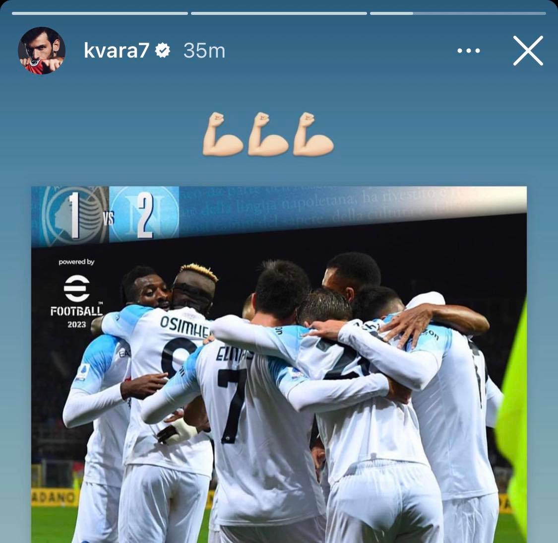 Assente per lombalgia acuta, Kvara ha esultato da casa per la vittoria del Napoli. A fine partita il 77 azzurro ha postato una foto per festeggiare la bella vittoria di Bergamo.