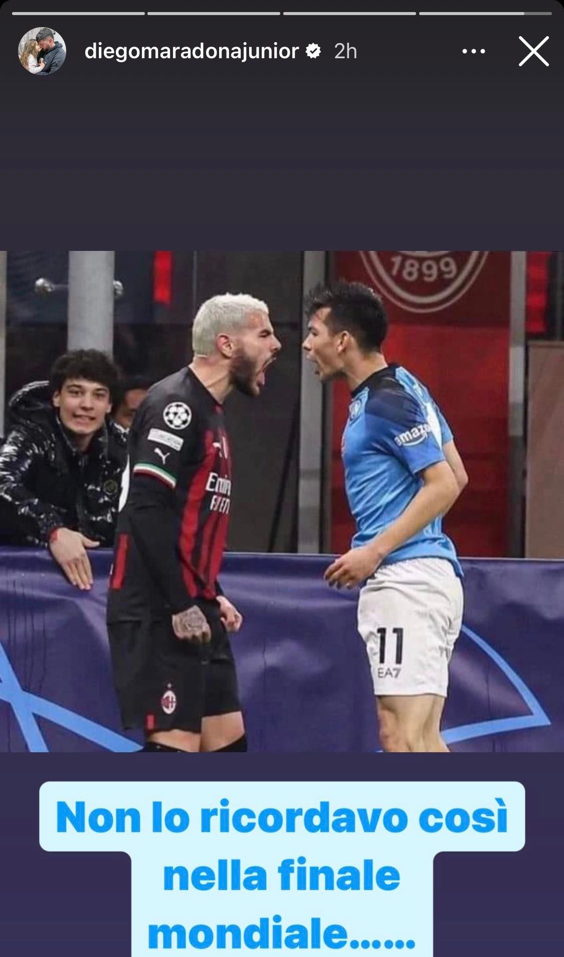 Diego Armando Maradona jr attacca Theo Hernandez per il suo atteggiamento nei confronti di Hirivng Lozano nell'andata dei quarti di finale di Champions League tra Milan e Napoli. 'Dieguito' con una Instagram Story ha pubblicato lo scatto di quel momento: "Non lo ricordavo così nella finale mondiale...".