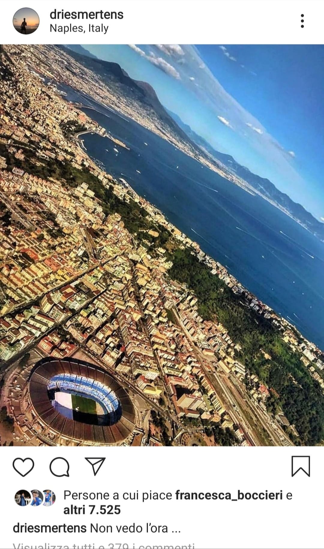 Dries Mertens ha voglia di Napoli: non solo della maglia azzurra, ma anche della città. ll belga ha infatti pubblicato su Instagram una meravigliosa foto che ritrae dall'alto la città partenopea, accompagnandola con un chiaro messaggio: "Non vedo l'ora". Sempre più forte, ormai, il legame tra il belga e la sua nuova città di adozione.