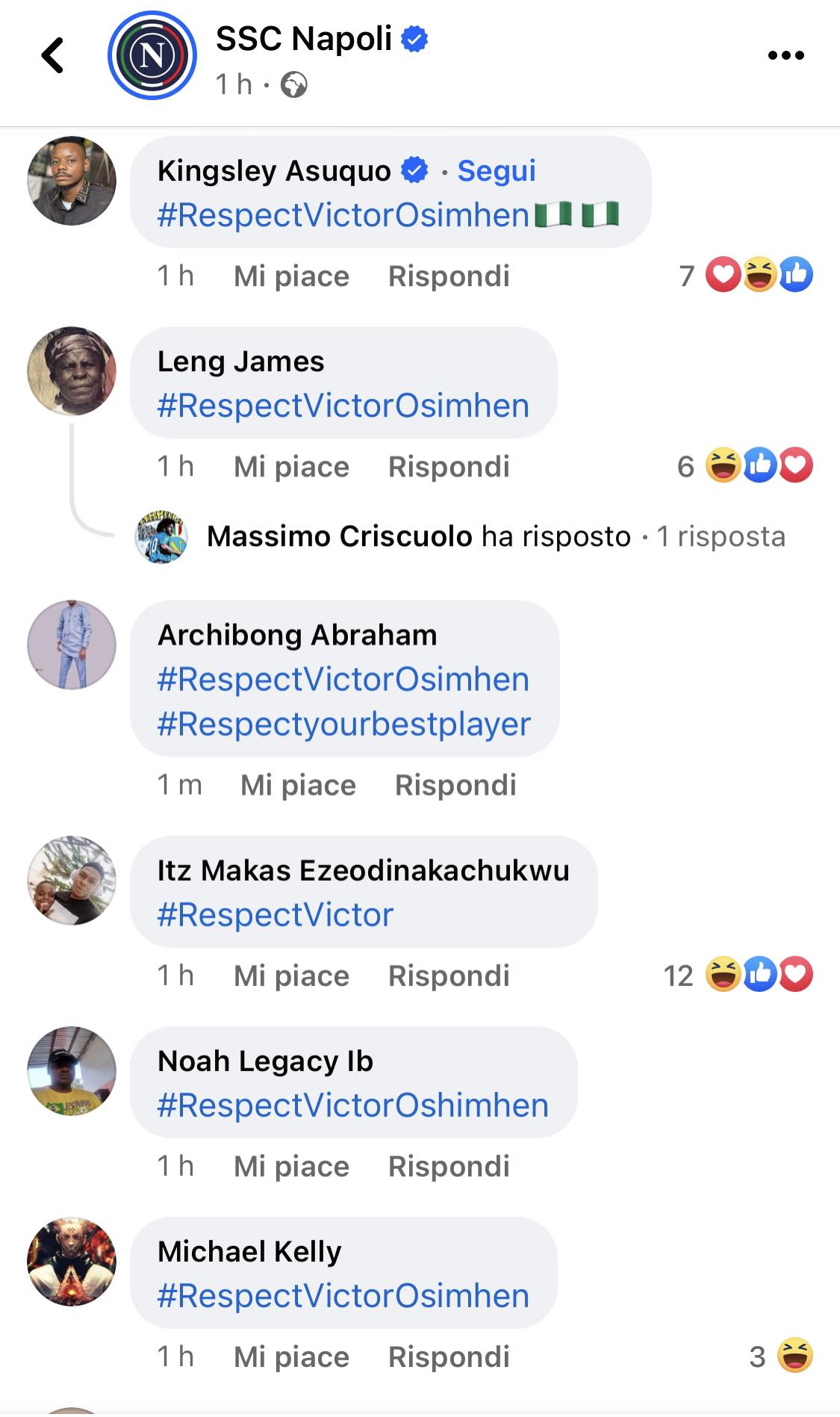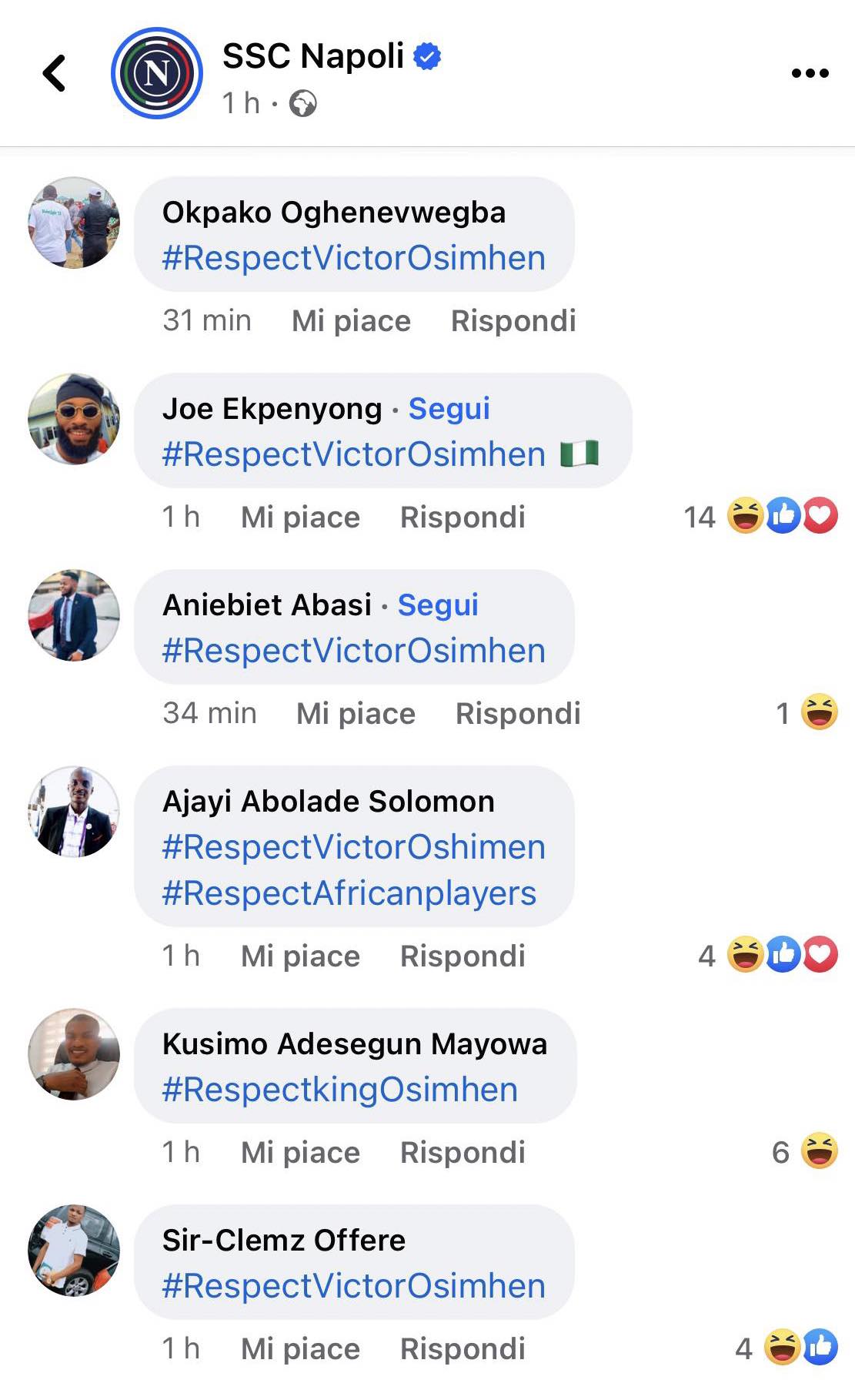 Nigeriani scatenati sui social. Anche quest’oggi i profili social del club azzurro sono stati inondati da un'incredibile quantità di hashtag pro-Osimhen e di commenti negativi da parte dei tifosi nigeriani contro la società e la città, tacciate di essere razziste nei confronti del loro beniamino. Di seguito le immagini.