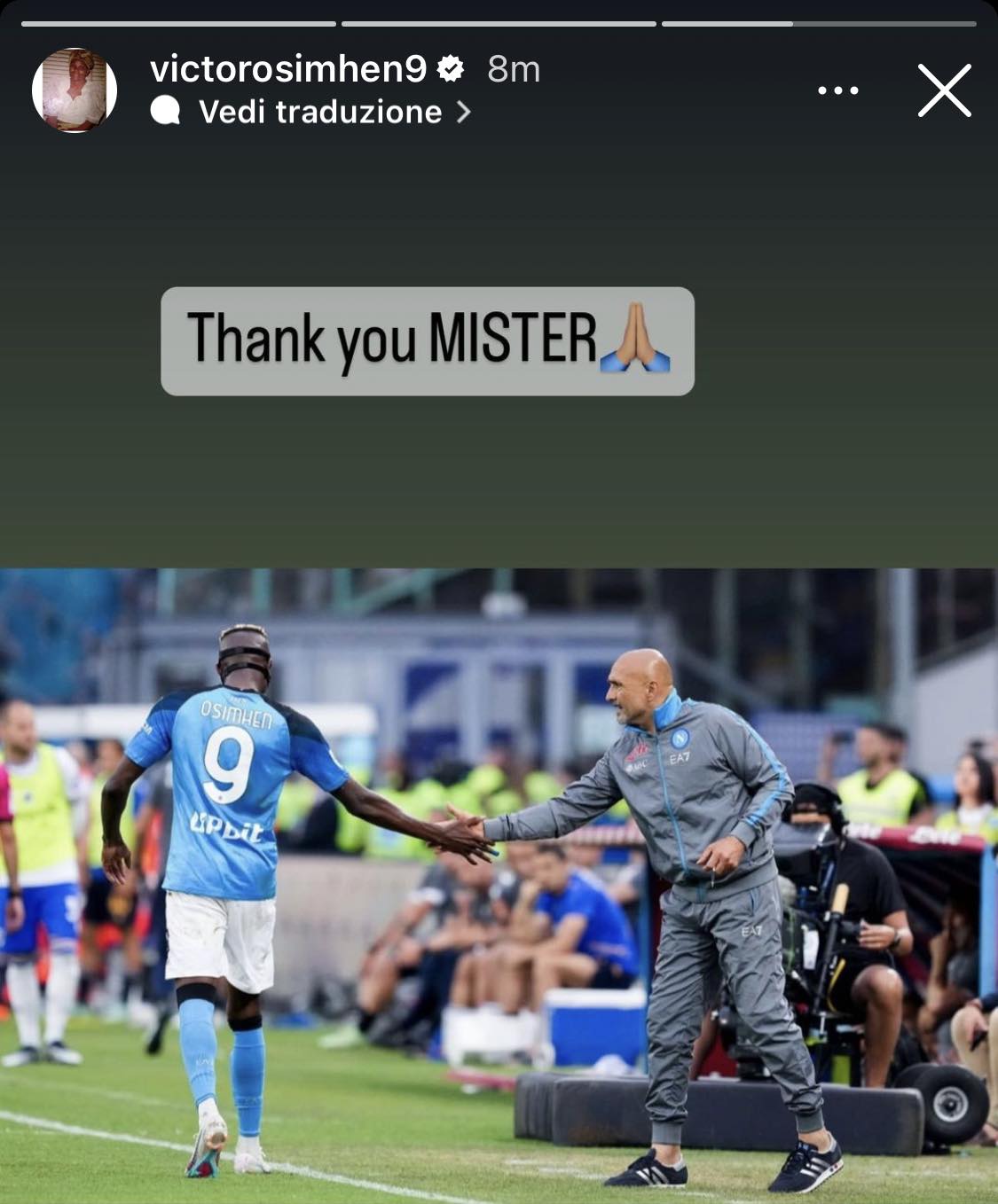 La gratitudine di Victor Osimhen per Luciano Spalletti, l'allenatore con cui ha realizzato il suo record di gol. Ora che l'addio e il suo successore sono ufficiali, il centravanti nigeriano ha voluto salutare con una Instagram Story l'ormai ex allenatore azzurro: "Grazie mister". Di seguito lo scatto.