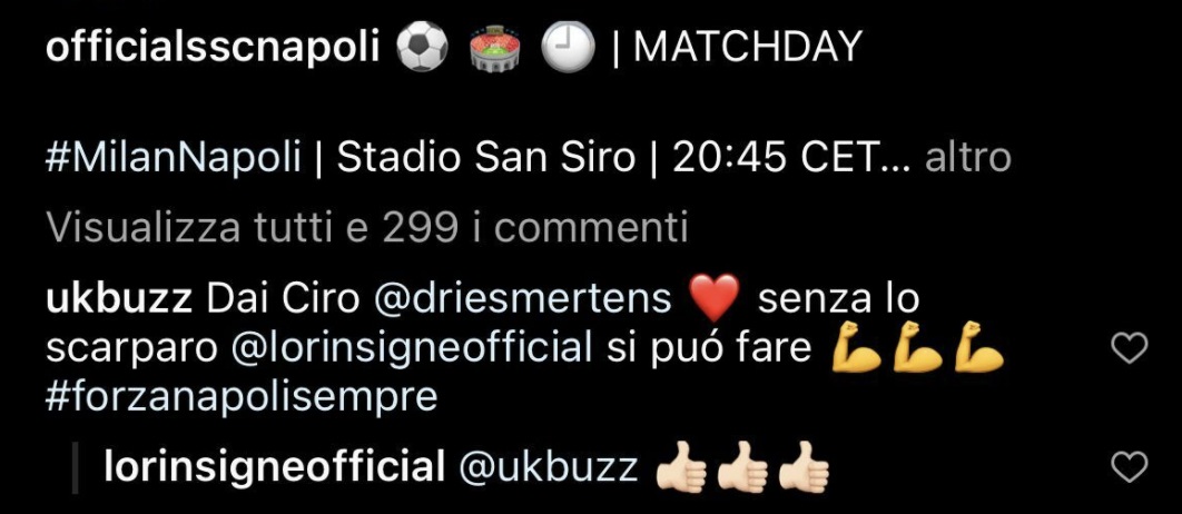 Lorenzo Insigne, alle prese con guai muscolari al polpaccio, non parteciperà alla sfida di stasera contro il Milan. Tra il capitano azzurro e un tifoso napoletano oggi è andato in scena un piccato botta e risposta su Instagram. Sotto al post social del Napoli, dedicato alla partita di stasera, è comparso un commento non certo lusinghiero nei confronti del numero 24 azzurro: "Senza lo scarparo Insigne si può fare". Immediata la replica di Insigne, con una serie di ironici emoji a forma di pollice. Di seguito il post, che successivamente è stato rimosso.