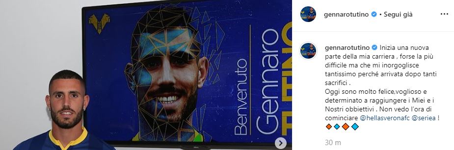 Una nuova avventura per Gennaro Tutino. Da poche ore, infatti, è ufficiale il passaggio in prestito dell'azzurrino all'Hellas. Il giocatore si è presentato cosi ai nuovi tifosi su Instagram: "Inizia una nuova parte della mia carriera, forse la più difficile ma che mi inorgoglisce tantissimo perché arrivata dopo tanti sacrifici .Oggi sono molto felice, voglioso e determinato a raggiungere i Miei e i Nostri obbiettivi. Non vedo l’ora di cominciare".