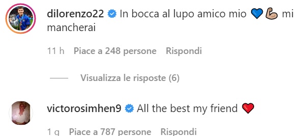 Giovanni Di Lorenzo ha scritto sul social: "In bocca al lupo amico mio, mi mancherai". Al messaggio del terzino azzurro fa seguito quello di Victor Osimhen: "Tutto il meglio, amico mio".