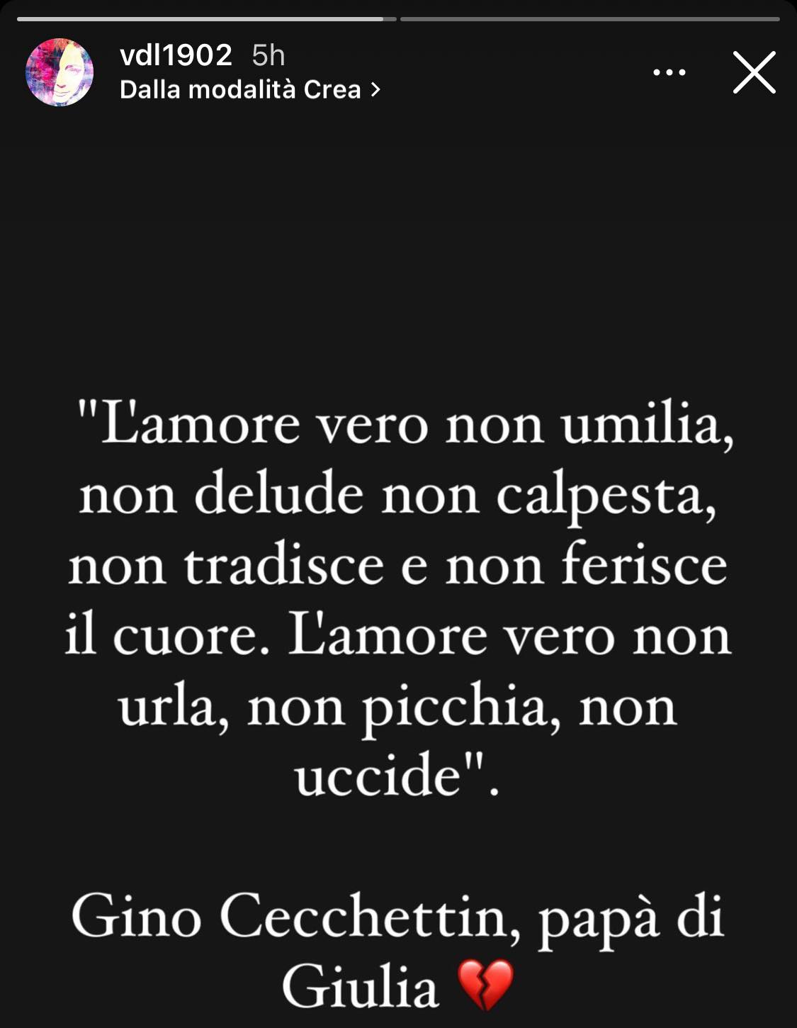 ll papà di Giulia Cecchettin, sommerso nel dolore per il brutale omicidio della figlia, ha pubblicato su Facebook una frase, stampata su una foto in bianco e nero, piena di rabbia e dolore: "L'amore vero non umilia, non delude non calpesta, non tradisce e non ferisce il cuore. L'amore vero non urla, non picchia, non uccide". Valentina De Laurentiis, Style Designer della SSC Napoli, ha postato in una storia Instagram la stessa frase in segno di vicinanza alla famiglia Cecchettin.