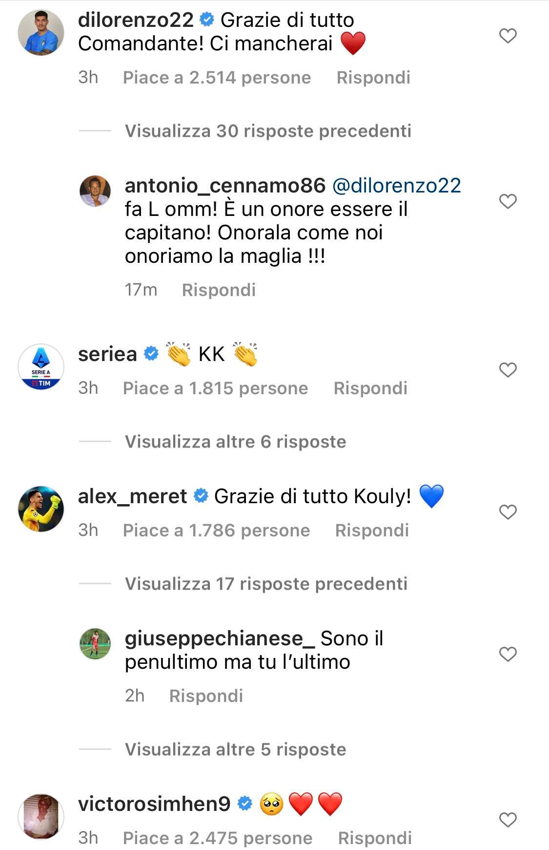 Il toccante post di addio a Napoli di Kalidou Koulibaly su Instagram è stato inondato da tantissimi messaggi. Tra questi in evidenza quelli dei suoi ormai ex compagni di squadra che in coro lo ringranziano per gli anni passati insieme. Il nuovo capitano del Napoli, Giovanni Di Lorenzo che raccoglie in eredità la fascia dal senegalse, scrive: "Grazie di tutto comandante, ci mancherai".