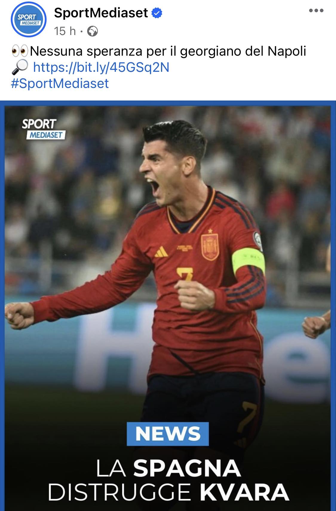 "La Spagna distrugge Kvara", si legge in un post social di Sportmediaset che ha fatto infuriare i tifosi del Napoli. L'umiliazione della Georgia, sconfitta ieri per 7-1, ha comportato non poche critiche per la stella del Napoli che nulla ha potuto nella giornata no di tutta la squadra. "Mica giocava da solo", il messaggio ricorrente dei tifosi azzurri.