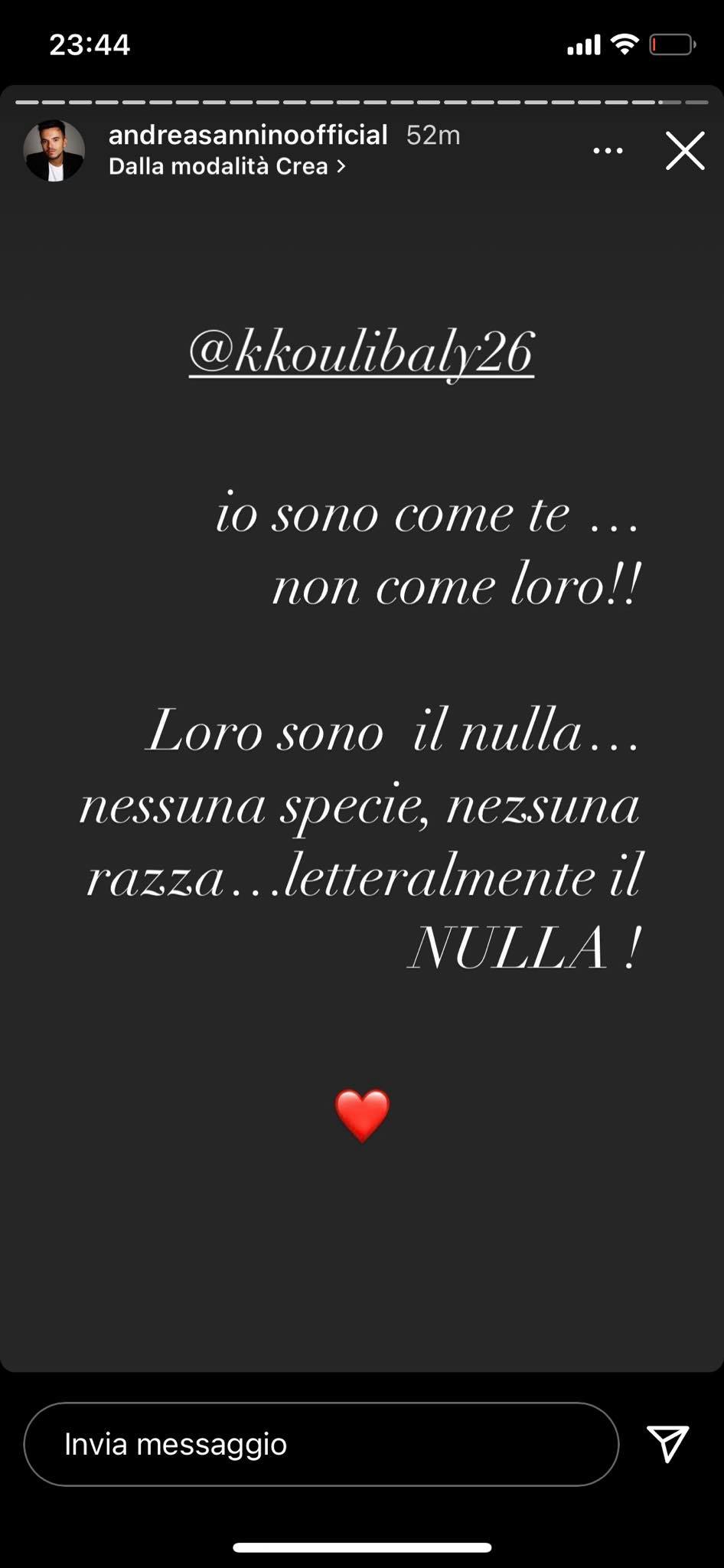 Dopo il bruttissimo episodio di razzismo allo stadio Franchi di Firenze, il cantante napoletano Andrea Sannino ha postato su Instagram un bellissimo messaggio di solidarietà nei confronti di Kalidou Koulibaly: "Io sono come te... non come loro!!! Loro sono il nulla... nessuna specie, nessuna razza... letteralmente il NULLA!"