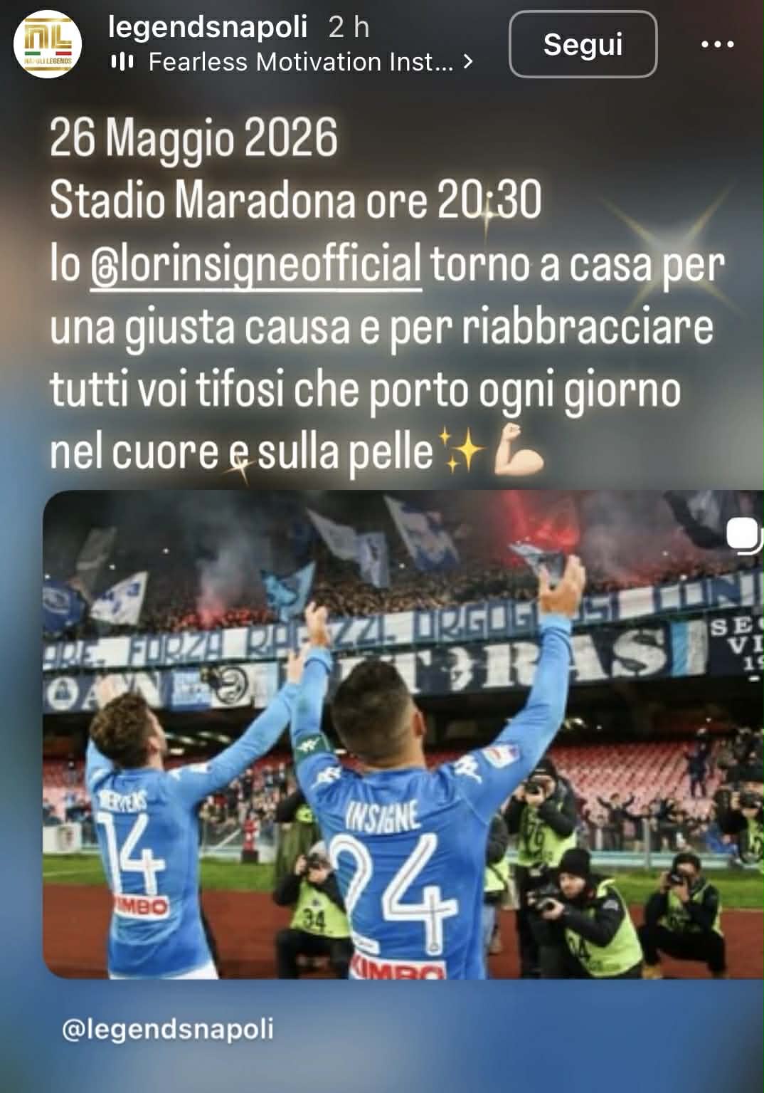 "26 maggio 2026, stadio Maradona ore 20.30. Io Lorenzo Insigne torno a casa per una giusta causa e per riabbracciare tutti voi tifosi che porto ogni giorno nel cuore e sulla pelle", il messaggio sui social. L'attaccante attualmente al Pescara fu anche contattato dal Napoli, come emerso da alcune sue dichiarazioni, ma poi il ritorno non s'è concretizzato. Ora è previsto quantomeno quello nell'impianto di Fuorigrotta.