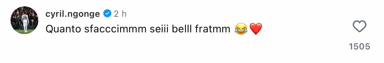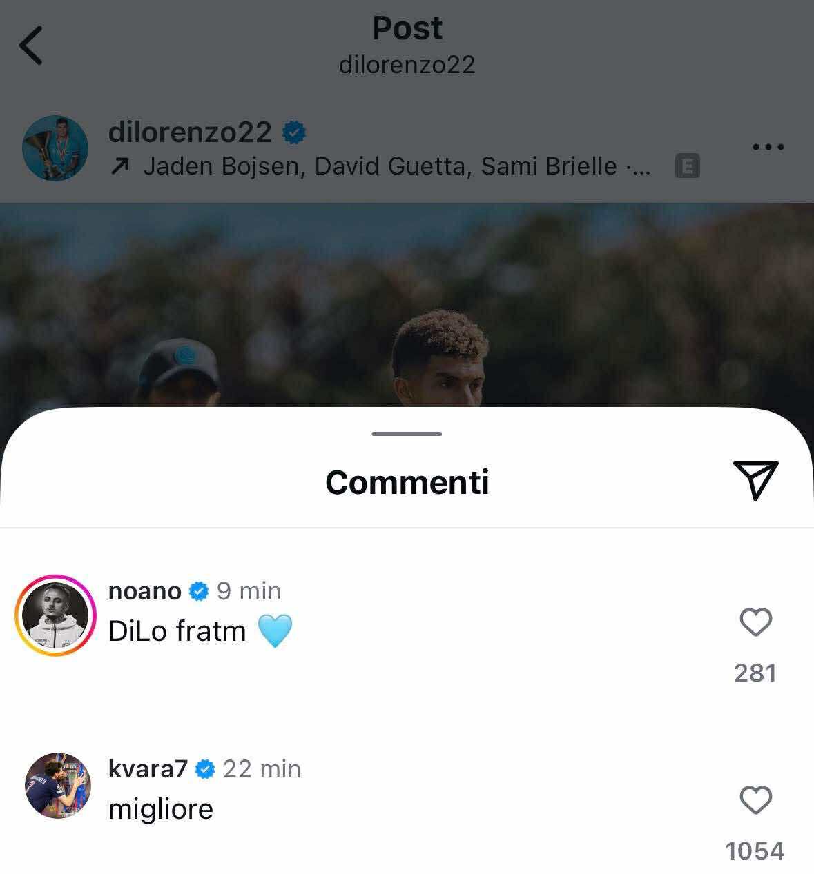Tra i commenti spunta anche quello dell'erede di Kvara sulla fascia sinistra, Noa Lang, che scrive in napoletano al terzino del Napoli: "DiLo fratm". Oltre al nuovo acquisto anche Cyril Ngonge, appena trasferito in prestito al Torino, commenta scrivendo in lingua partenopea: "Quanto sfa...m sei bell fratm".