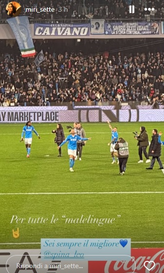 Festeggia la vittoria in rimonta contro la Juventus, allo stadio Maradona, anche Miriam Sette, moglie dell'azzurro Leonardo Spinazzola. A fine partita la compagna dell'esterno del Napoli esulta così, taggandolo su Instagram: "Sei sempre il migliore, per tutte le malelingue....".