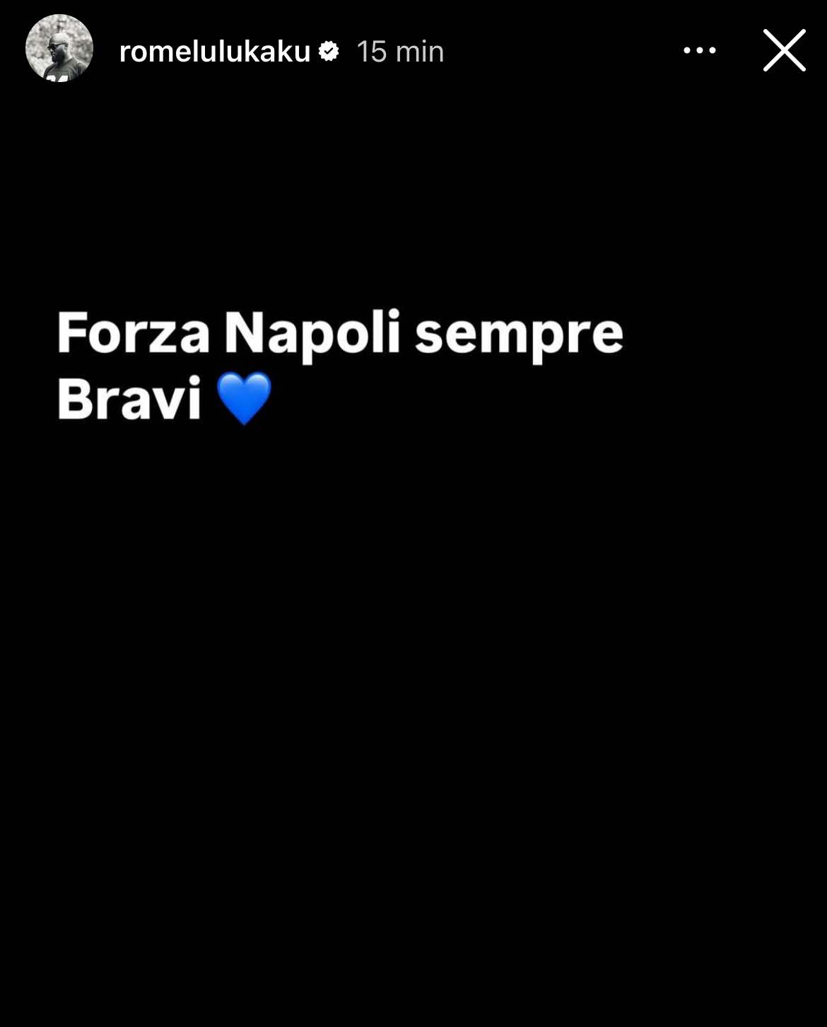 "Bravi, Forza Napoli sempre", è questo il messaggio di Romelu Lukaku dopo la vittoria per 2-0 dei suoi compagni azzurri, all'esordio stagionale contro il Sassuolo. Big Rom è stata l'assenza eccellente della partita: il belga ha rimediato un infortunio muscolare che lo terrà ai box per diversi mesi, così ha seguito la partita da casa e ci ha tenuto a supportare i compagni con una story sul suo profilo Instagram. Di seguito la foto.