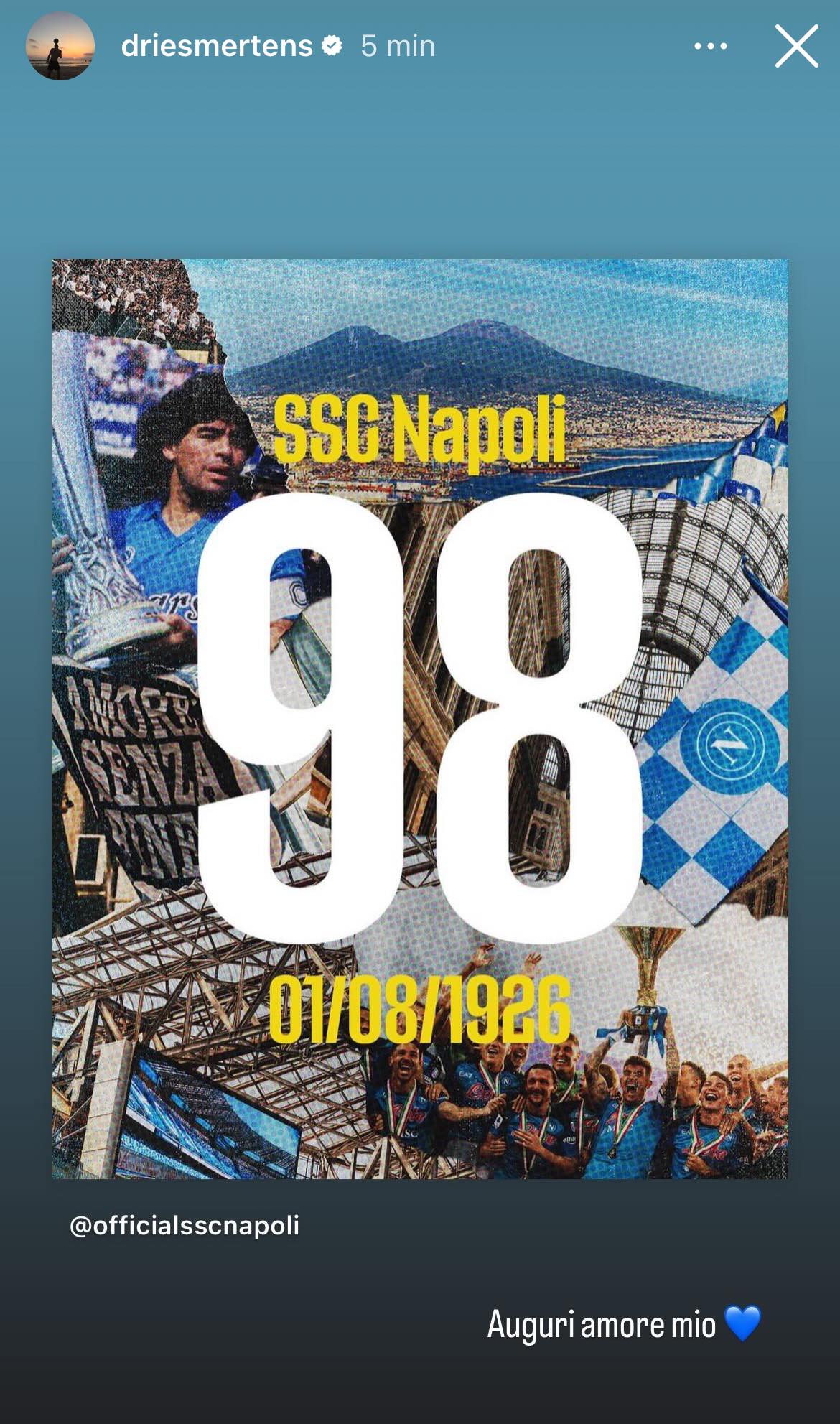 Per i 98 anni di storia, che il Napoli festeggia oggi, piovono copiosi i post sui social. Da parte degli azzurri e anche da parte di chi a Napoli ha lasciato un pezzo di cuore. Tra questi c'è senza dubbio anche Dries Mertens, che su Instagram ha ripubblicato il post del club azzurro e aggiunto la didascalia: "Auguri amore mio".
