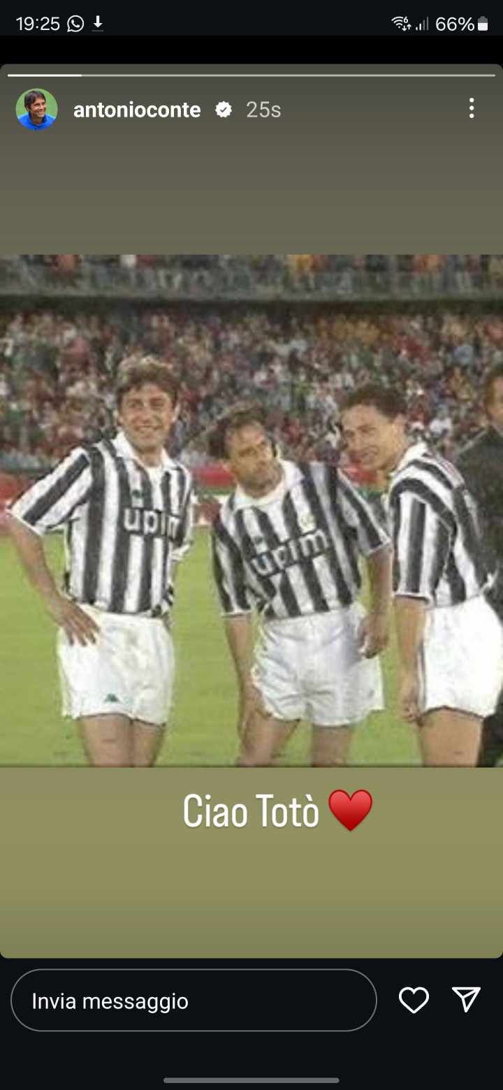 Il mondo del calcio è in lutto per la scomparsa di Totò Schillaci. Anche il suo ex compagno di squadra Antonio Conte ha voluto dedicare un messaggio di cordoglio per l'indimenticabile protagonista di Italia 90. Infatti l'allenatore del Napoli lo ha ricordato con una foto su Instagram che ritrae i due insieme con la maglia della Juventus, e ha scritto "Ciao Totò", con un cuore. Di seguito la foto