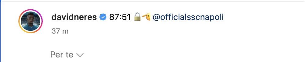 Così David Neres ha deciso di immortalare questo momento speciale. Sul suo profilo Instagram ufficiale, che conta ben 2.4 milioni di follower, ha pubblicato una fotogallery con gli scatti del match e in didscalia ha scritto il minutaggio esatto del suo ingresso in campo: "87:51", affiancato da un lucchetto e un tag a SSC Napoli. Di seguito la foto