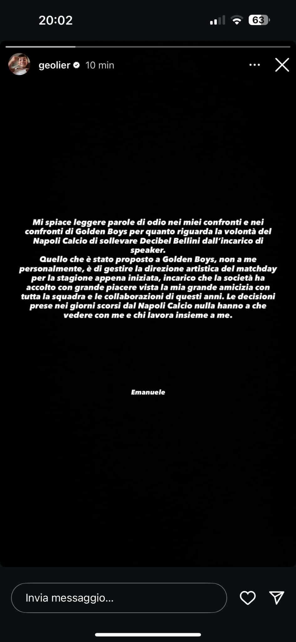 Daniele 'Decibel' Bellini non è più lo speaker ufficiale del Napoli. Il club azzurro e Golden Boys, società di cui fa parte anche Geolier, annunciano una partnership per la gestione dell’intrattenimento allo Stadio Diego Armando Maradona. Il noto cantante rapper pubblica una 'storia' per chiarire la situazione e la sua posizione su Instagram: "Mi spiace leggere parole di odio nei miei confronti e nei confronti di Golden Boys per quanto riguarda la volontà del Napoli Calcio di sollevare Decibel Bellini dall'incarico di speaker.
