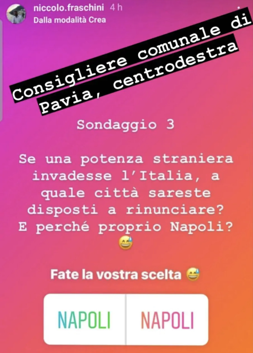 "Se una potenza straniera invadesse l'Italia, a quale città sareste disposti a rinunciare? E perché proprio Napoli? Fate la vostra scelta: Napoli o Napoli". Questo l'incredibile sondaggio social lanciato da Niccolò Fraschini, consigliere comunale di Pavia, che sta suscitando reazioni e indignazione sul web nelle ultime ore.