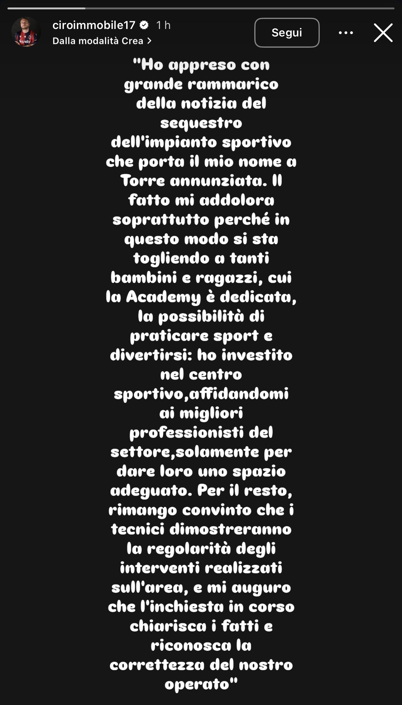 La presa di posizione di Ciro Immobile pubblicata sul proprio account Instagram: "Ho appreso con grande rammarico della notizia del sequestro dell'impianto sportivo che porta il mio nome a Torre Annunziata - ha scritto l'ex capitano della Lazio in una Instagram Stories -. Il fatto mi addoloro soprattutto perché in questo modo si sta togliendo a tanti bambini e ragazzi, cui la Academy è dedicato, la possibilità di praticare sport e divertirsi: ho investito nel centro sportivo, affidandomi ai migliori professionisti del settore, solamente per dare loro uno spazio adeguato. Per il resto, rimango convinto che i tecnici dimostreranno la regolarità degli interventi realizzati sull'area, e mi auguro che l'inchiesta in corso chiarisca i fatti e riconosca la correttezza del nostro operato".