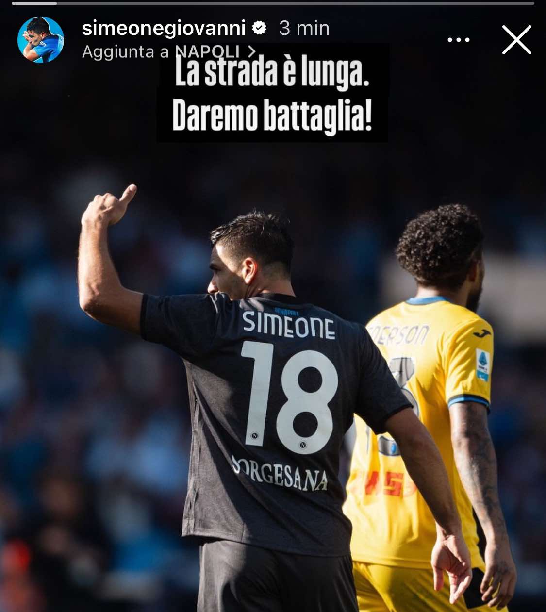 Giovanni Simeone, entrato nel secondo tempo di Napoli-Atalanta, non si abbatte dopo il primo ko casalingo stagionale degli azzurri. Al termine del match perso 0-3 al Maradona contro l'Atalanta, l'attaccante azzurro pubblica un 'storia' Instagram, scrivendo: "La strada è lunga. Daremo battaglia!".