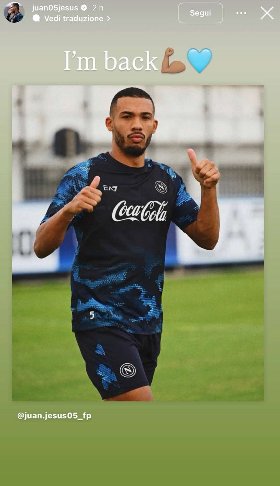 Quello che sembrava una cosa impossibile ora potrebbe tramutarsi in realtà. E' stato proprio Juan Jesus ha dare un indizio social con una 'storia' pubblicata su Instagram dove scrive: "Sono tornato". Nello scatto si vede il brasiliano con i due pollici su mentre si allena a Castel Volturno. Di seguito l'immagine.