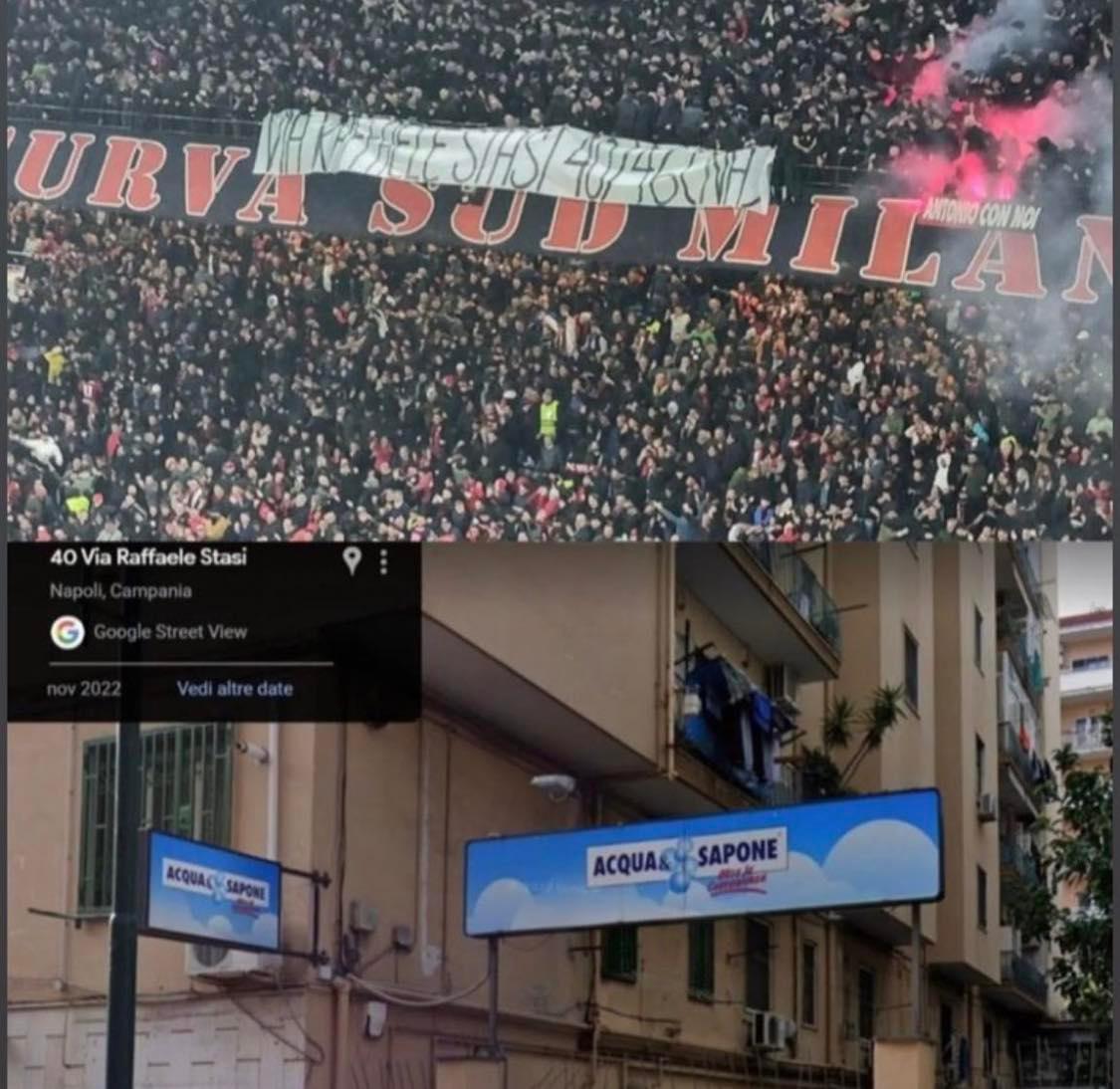 E' divenuto virale lo striscione (dal significato troglodita) dei tifosi del Milan contro quelli napoletani in cui si faceva riferimento a 'Via Raffaele Stasi 46', ossia il posto in cui a Napoli sorge il negozio 'Acqua&Sapone', tema di un vergognoso coro contro i napoletani. Un modo per eludere i controlli e non essere neanche sanzionati per discriminazioni territoriali. Su Facebook però è diventata a sua volta virale anche la risposta ironica del titolare del punto vendita: