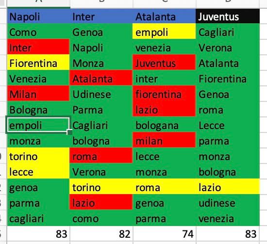 Secondo questi calcoli l'Inter perderebbe 3 partite contro Atalanta, Roma e Lazio, pareggerebbe col Torino confezionando in totale 82 punti. Quattro sconfitte, invece, per l'Atalanta contro Juventus, Fiorentina, Lazio e Milan, due pareggio con Empoli e Roma per un totale di 74 punti. Infine la Juventus avrebbe addirittura la strada spianata vincendo tutte 12 gare su 13 e pareggiando solo con la Lazio ottenendo così 83 punti come il Napoli.