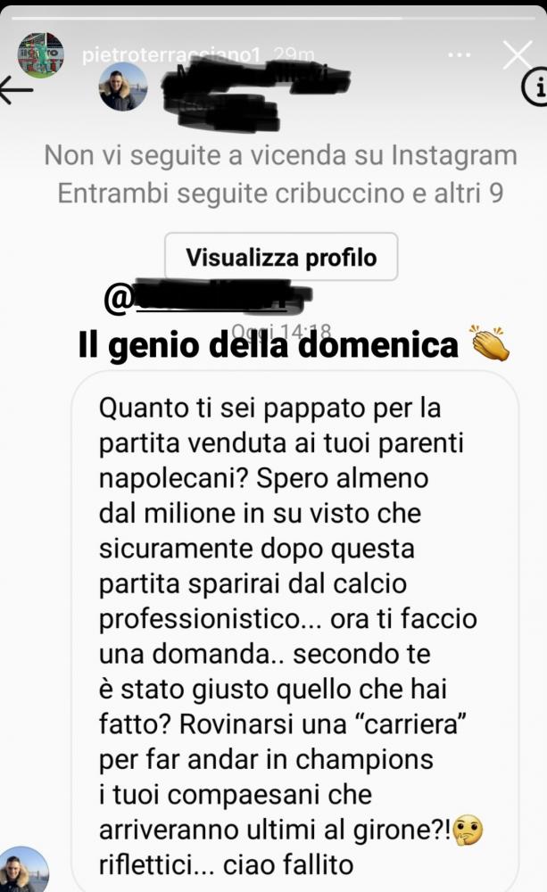 Battibecco via social tra Pietro Terracciano, portiere della Fiorentina, e un tifoso (probabilmente della Juventus). Il secondo portiere viola, oggi titoalre contro il Napoli, ha pubblicato sul suo profilo Instagram una foto che immortala il testo di un messaggio nel quale veniva attaccato per aver "venduto ai suoi parenti napolecani" la partita di oggi. "Ecco il genio della domenica" ha commentato Terracciano. Di seguito la foto del post.