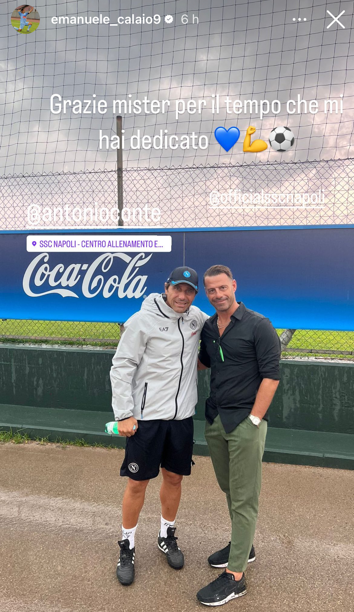 Visita speciale oggi a Castel Volturno per Antonio Conte. All'allenamento odierno ha assistito Emanuele Calaiò, ex attaccante azzurro che è stato allenato dal tecnico del Napoli ai tempi del Siena. A testimoniare il tutto è stato proprio Calaiò, che sui social ha postato uno scatto con Conte accompagnato dalla seguente didascalia: "Grazie del tempo che mi hai dedicato mister".
