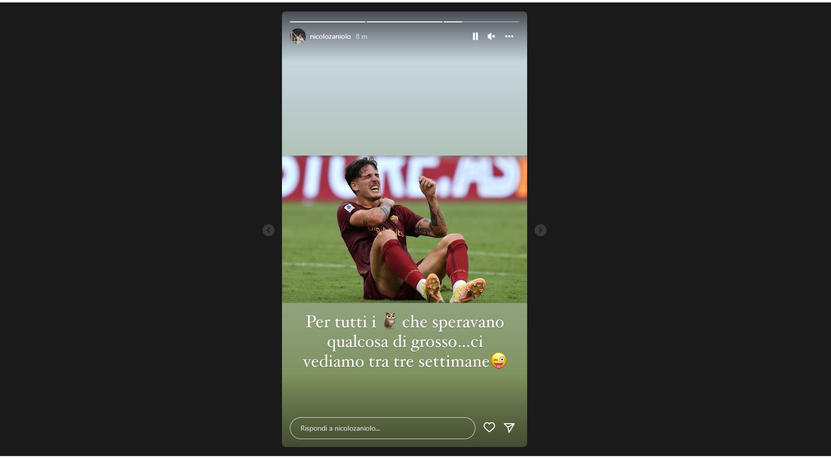 "Per tutti i gufi che speravano qualcosa di grosso... ci vediamo tra tre settimane" è il messaggio via Instagram Story di Nicolò Zaniolo, poche ore dopo l'infortunio rimediato contro la Cremonese. Il trequartista a seguito di un contrasto di gioco con Lochoshvili si è procurato la lussazione della spalla. Si è temuto il peggio ma per fortuna non sarà necessario l'intervento chirurgico. Preso di mira sui social il giocatore ha deciso di replicare così.