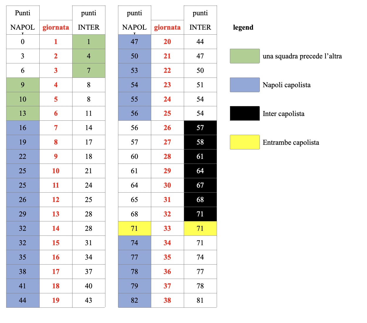 I numeri parlano chiaro. Sia pur sul filo di lana, il Napoli è stato più forte dell’Inter. Nessuna delle due ha dominato. Hanno combattuto punto a punto (con un vantaggio massimo del Napoli di 4). Grande equilibrio e tante occasioni perse da entrambe le parti. Alla fine, l’ha spuntata il Napoli, con merito.