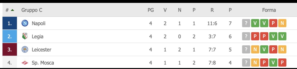 CLASSIFICA - Napoli da solo al comando: +1 sul Legia e +2 sul Leicester