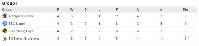 Ecco la classifica del Girone I di Europa League dopo la quarta giornata: il Napoli resta primo a pari punti con lo Sparta Praga grazie al successo interno sullo Young Boys.
