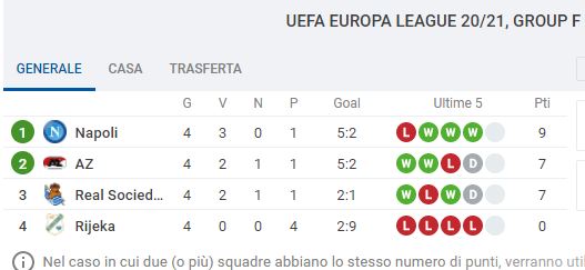 Con la vittoria di stasera il Napoli di Gattuso si porta al primo posto del girone di Europa League con 9 punti in classifica. Per AZ e Real Sociedad, invece, il pareggio ha portato il totale a 7 punti ed ora saranno costrette ad inseguire nelle ultime due partite. Matematicamente eliminato, invece, il Rijeka.