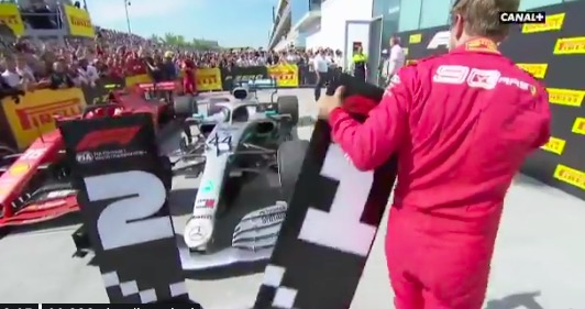 La Ferrari di Sebastian Vettel taglia il traguardo del GP del Canada al primo posto ma deve cedere la vittoria alla Mercedes di Lewis Hamilton, che chiude alle sue spalle, per una penalità di cinque secondi. Sanzione inflitta al tedesco per aver ostacolato l'inglese al giro 48 dopo aver tagliato una curva finendo sul prato. Furiose le polemiche per una decisione, quella della penalità a Vettel, assai discutibile. Vettel, nell'andare verso il podio, ha alternato il cartello con il numero 1 di Hamilton con il suo numero 2 in segno di protesta.