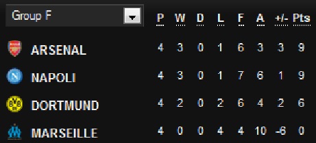 CLASSIFICA – Arsenal espugna Dortmund, Napoli e gunners in vetta al girone F
