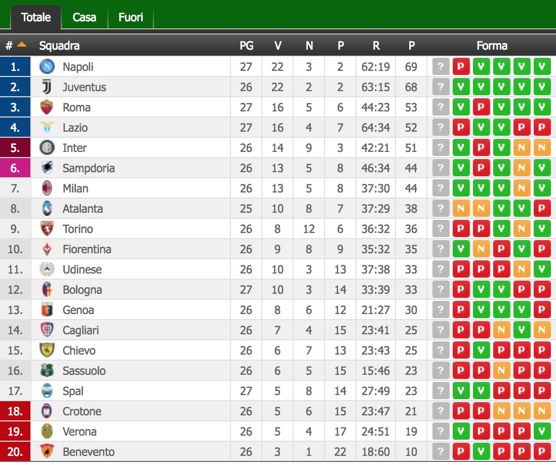 CLASSIFICA - Azzurri stoppati dalla Roma: +1 sulla Juve, che ha una gara da recuperare