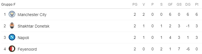 Questa la classifica del Gruppo F di Champions League dopo le sfide di questa sera: il Napoli aggancia lo Shakhtar al secondo posto, mentre il City, a punteggio pieno, va in fuga in testa. Peccato per la rete subita nel finale degli azzurri, che lascia la loro differenza reti a 1. Fermo a 0, ovviamente, il Feyenoord.