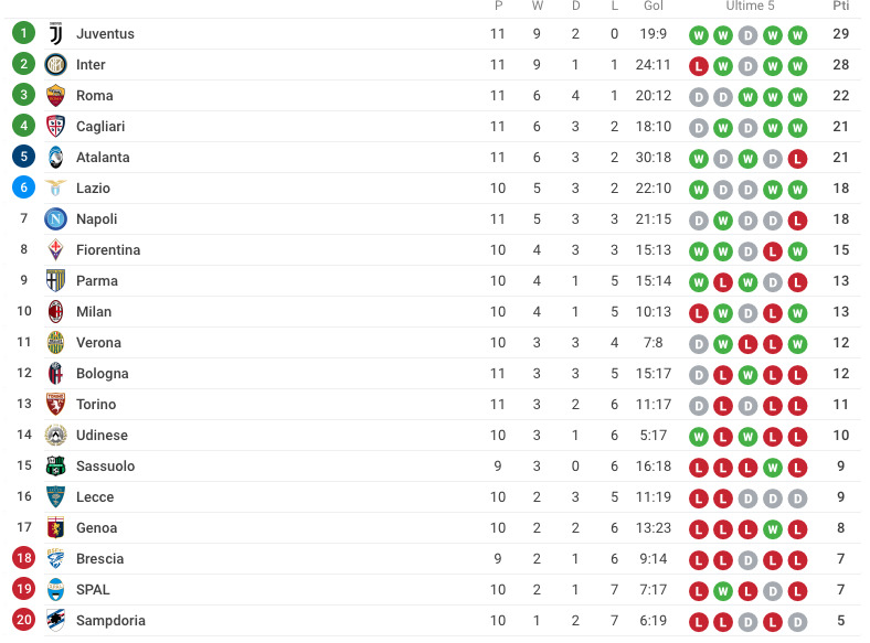 Dopo la grande vittoria del Cagliari in trasferta a Bergamo, i sardi salgono al 4° posto in classifica, appaiati proprio con l'Atalanta a quota 21 punti. In attesa delle restanti gare di questo turno, il Napoli, dopo la sconfitta a Roma, è distante 3 punti dalla zona Champions ed il distacco resterà inviariato anche in caso di vittoria della Lazio. Non una brutta notizia in un momento di grande difficoltà per i parteopei.