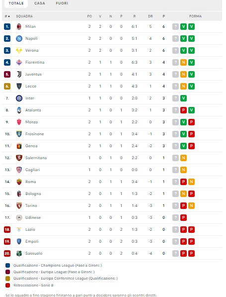 Vince ancora il Napoli, che dopo aver battuto il Frosinone alla prima giornata ha la meglio anche sul Sassuolo: 2-0 per Osimhen e compagni, 6 punti per i Campioni d'Italia, gli stessi di Milan e Hellas Verona. La squadra di Dionisi resta ferma a quota zero. Stessa situazione per la Lazio, che cade in casa contro il Genoa: al Grifone basta la rete di Retegui per conquistare la prima vittoria stagionale