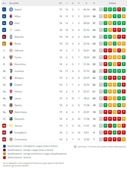 Il Napoli vince la sfida con la Salernitana e allunga in classifica. Sono 50 adesso i punti in classifica per gli azzurri dopo il girone d'andata, momentaneamente a + 12 sul Milan secondo in classifica. Quinto ko nelle ultime sei giornate per la Salernitana, che resta ferma a quota 18 punti.