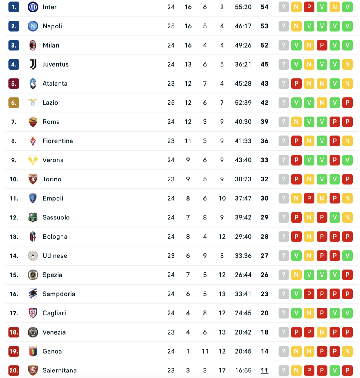 CLASSIFICA - Il Napoli resta a -1 dall’Inter: domani il Milan può portarsi al primo posto