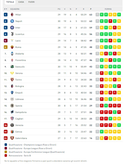 Col successo in rimonta sull’Udinese, il Napoli aggancia il Milan al primo posto in classifica a quota 63, con i rossoneri che scenderanno in campo stasera contro il Cagliari. Alle 18, invece, l’Inter avrà l’opportunità di accorciare i 4 punti di distanza dalla coppia di testa contro la Fiorentina. Questa la classifica aggiornata di Serie A: