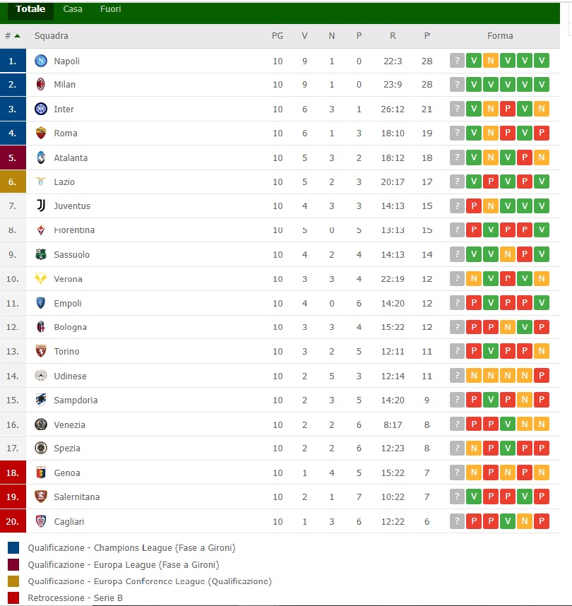 Per la decima volta su dieci giornate di Serie A 2021/22, il Napoli si conferma capolista: agganciato il Milan in vetta al campionato con 28 punti, e gli azzurri di Spalletti hanno anche una migliore differenza reti grazie ad una difesa di ferro, rimasta imbattuta anche oggi. 3-0 al Bologna, che rimane dunque a quota 12 punti in graduatoria. Di seguito la classifica aggiornata dopo il posticipo di Napoli: