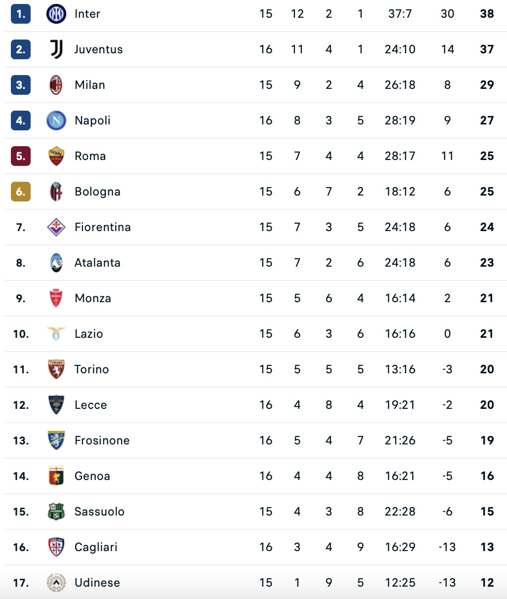 Il Napoli batte non senza difficoltà il Cagliari e si porta provvisoriamente al quarto posto in classifica, superando in un colpo solo Roma e Bologna. Questa la graduatoria aggiornata di Serie A: