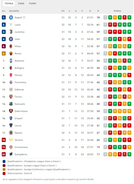 Importantissimo successo dell'Inter contro la Lazio nella prima gara della domenica di Serie A, con i nerazzurri che grazie a questo successo hanno raggiunto sia la Roma che il Milan al quarto posto, a -2 dalla Juve e a -4 dai biancocelesti. Adesso al Napoli basterà battere la Salernitana per vincere lo scudetto. Di seguito la classifica aggiornata.