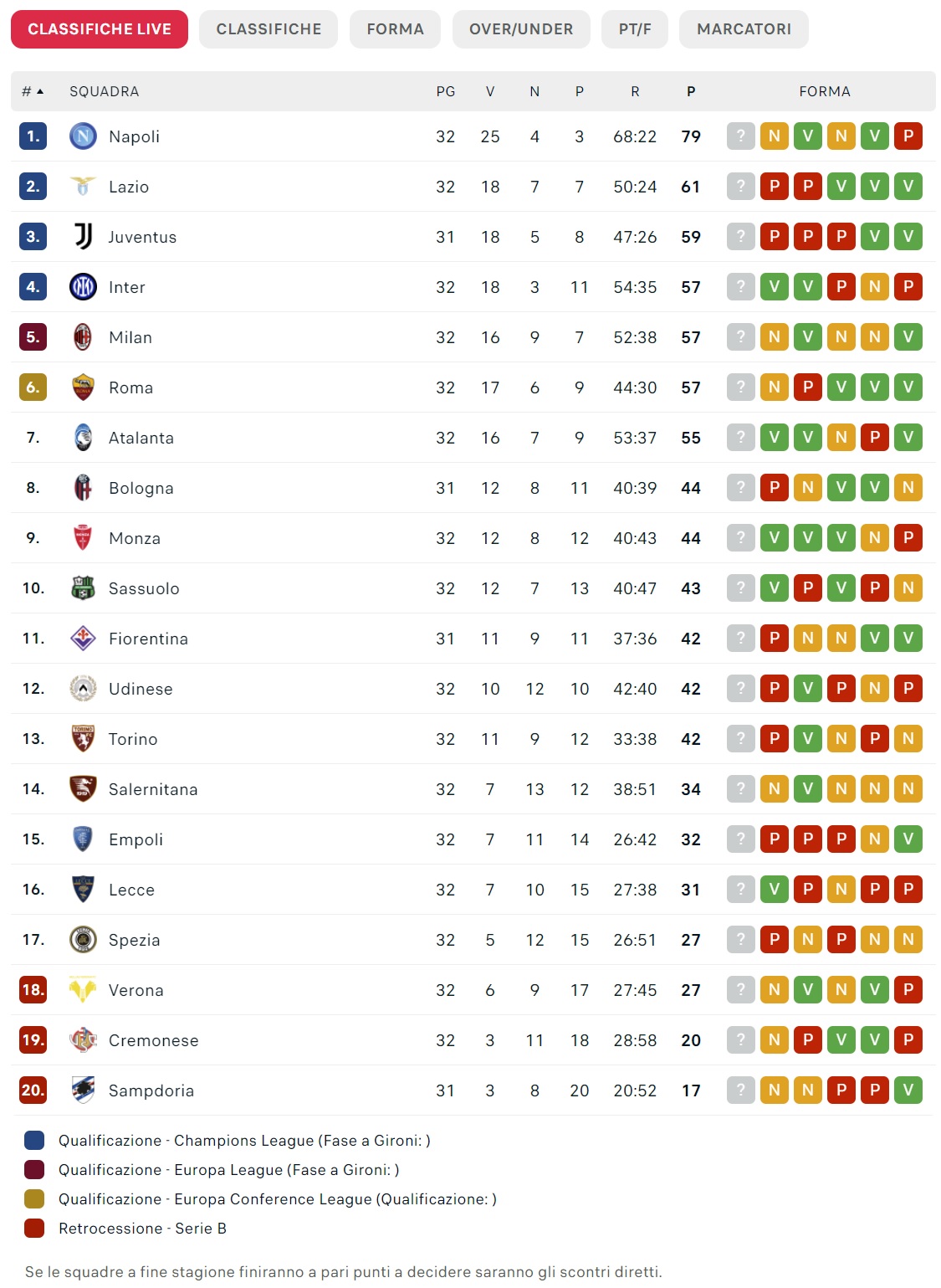 CLASSIFICA - La Salernitana rinvia la festa al Napoli: lo Scudetto non è ancora matematico