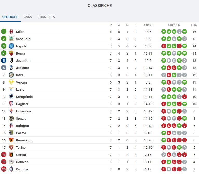 CLASSIFICA - Napoli a due punti dalla vetta in attesa del Milan