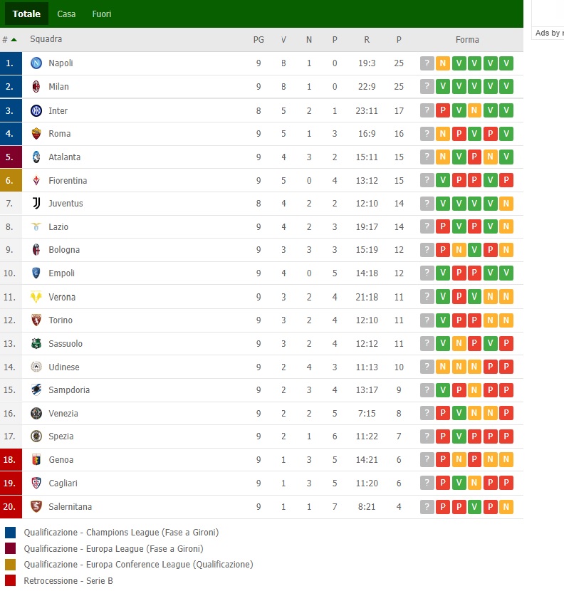 Si ferma a quota otto la striscia di vittorie consecutive del Napoli, che all'Olimpico non va oltre lo 0-0 contro la Roma. Questa la classifica aggiornata di Serie A in attesa del derby d'Italia che concluderà il nono turno: